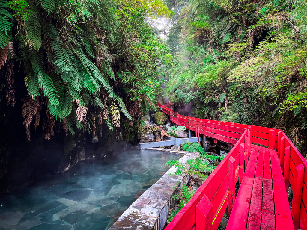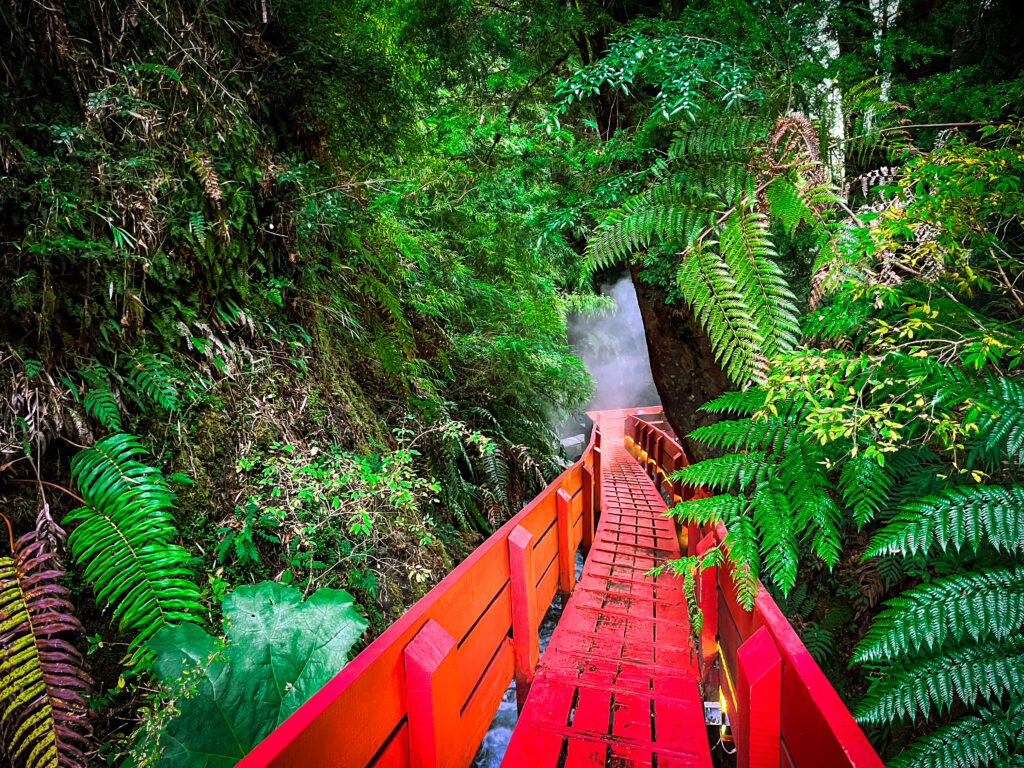 Quer durch die gesamte Schlucht führt ein roter Weg, der zwar vermutlich architektonisch sehr cool ist und auch für einen schönen Kontrast zum grünen Wald sorgt, allerdings EXTREM rutschig ist. Es empfiehlt sich dementsprechend gutes Profil auf den Badeschuhen :). Da wir die Therme im April besuchten, war in den südlicheren Regionen Chiles bereits der Herbst eingebrochen, weshalb auch ein Bademantel um diese Zeit empfehlenswert ist. Für mich war der Ausflug ein absolutes Highlight nicht nur von Chile sondern von der gesamten Südamerika Reise.